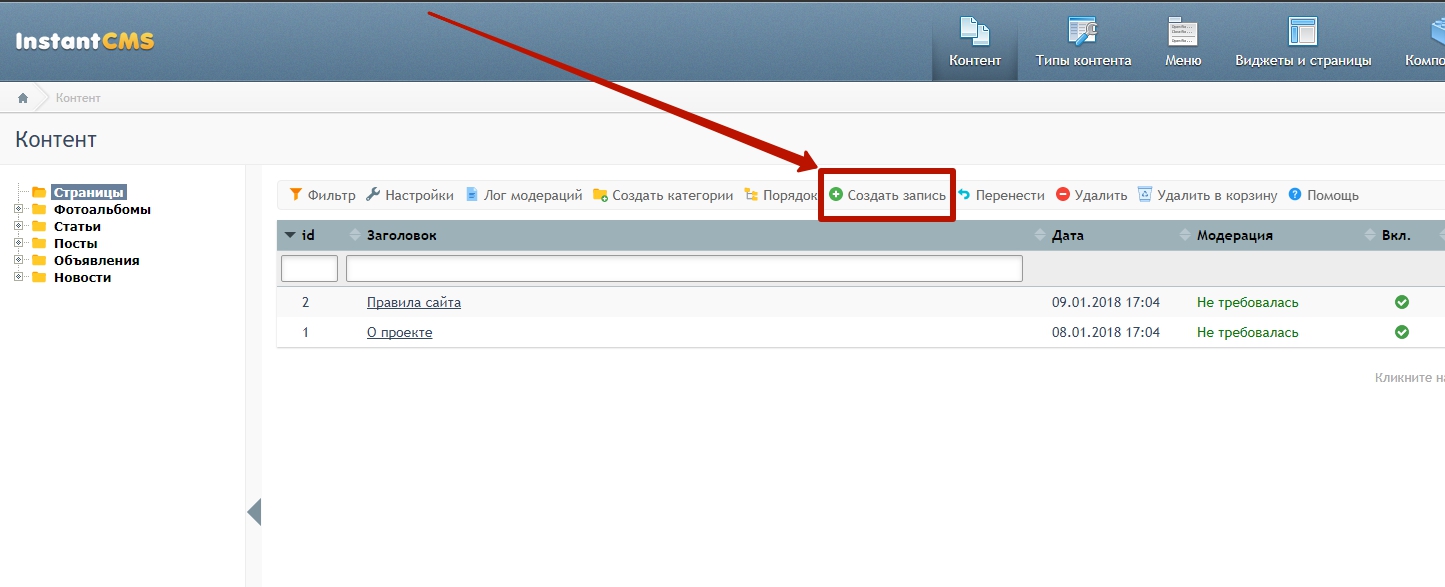 ещё один список подпунктов. Кликните левой кнопкой мыши по подпункту «Контент». Загрузится страница, на