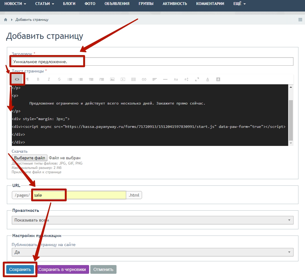 В инструкции описан вариант создания новой страницы сайта и добавления формы оплаты на вновь добавленную страницу. Это может быть, например, страница с промо акцией, ограниченным предложением товара, разовое предложение о продаже и т.д. Посетителю сайта не нужно будет входить в личный кабинет сайта, чтобы сделать покупку.