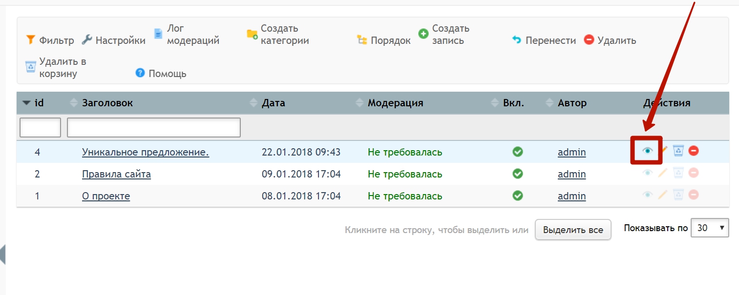 Вы можете посмотреть как будет выглядеть добавленная страница, нажав левой кнопкой мыши на иконке с изображением глаза и, при необходимости, внести необходимые корректировки расположения формы на странице: