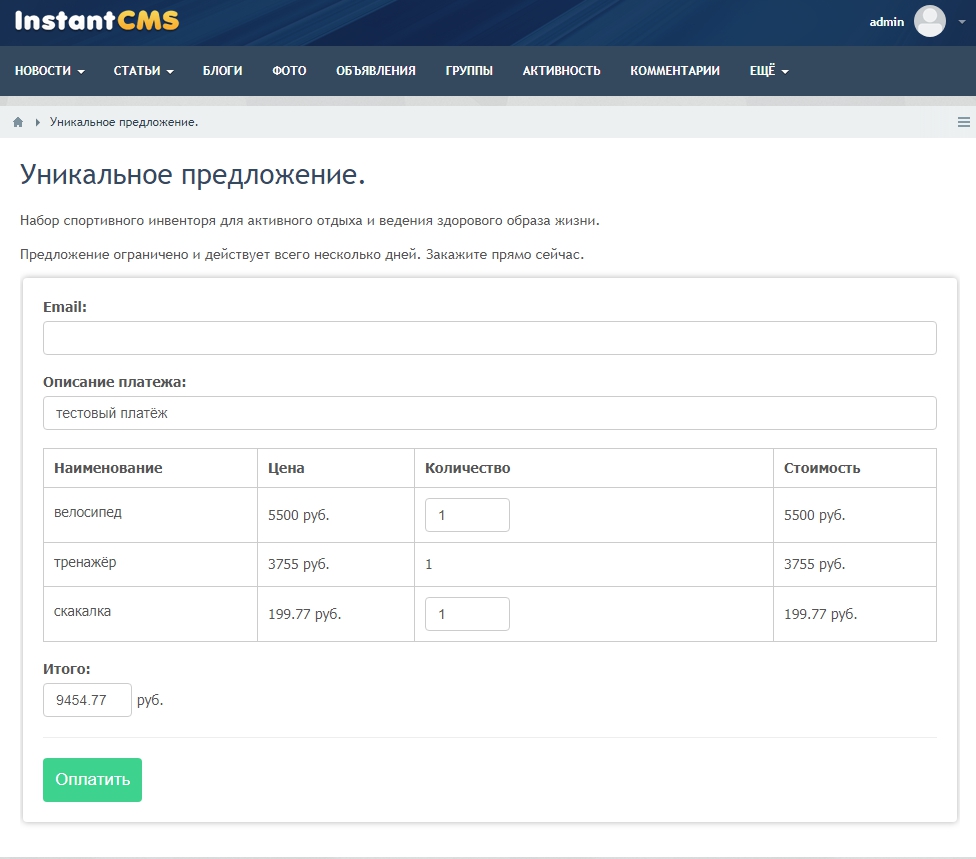 Для того, чтобы вставить форму оплаты на сайт, созданный в системе управления сайтом InstantCMS, достаточно проделать следующие действия: